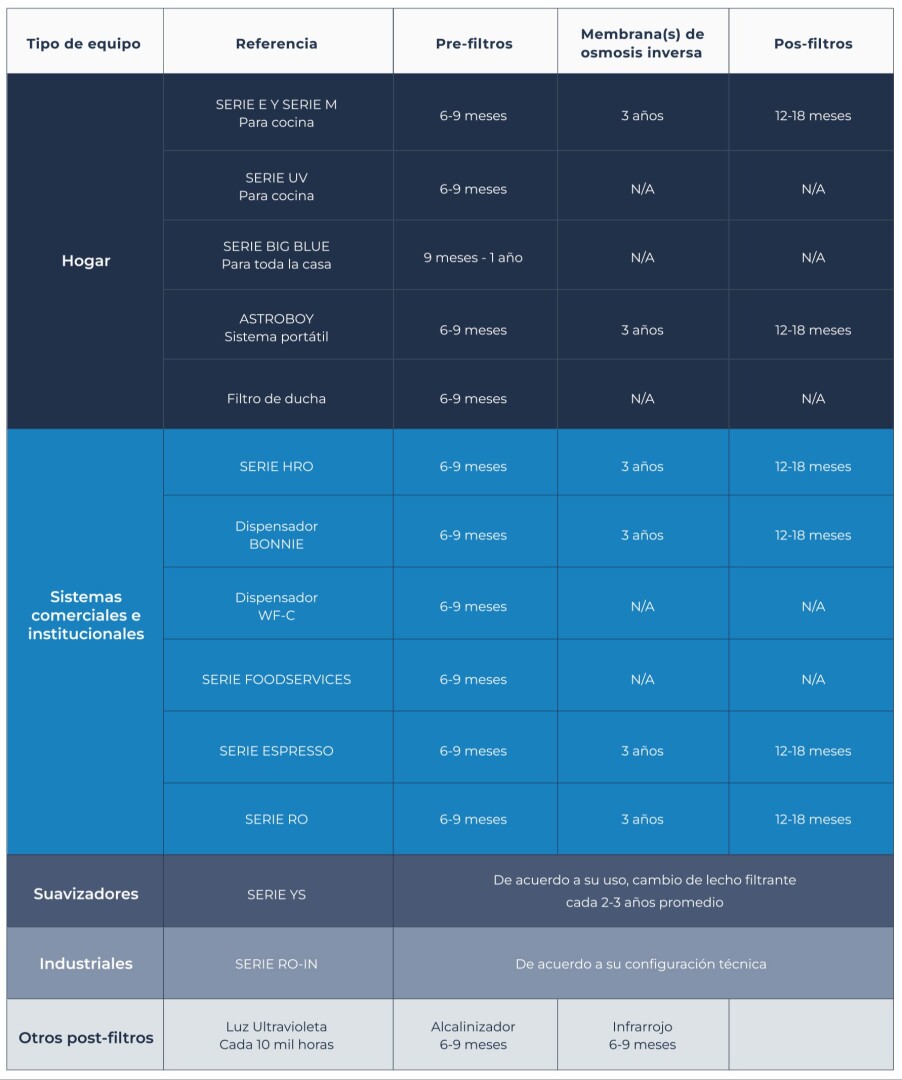 Dependiendo del tipo del equipo que tengas, la frecuencia con la que debes cambiar los pre filtros, la membrana filtradora y los post filtros varía. Adicionalmente, es posible que tu purificador tenga algunos complementos opcionales que también necesiten cambio.